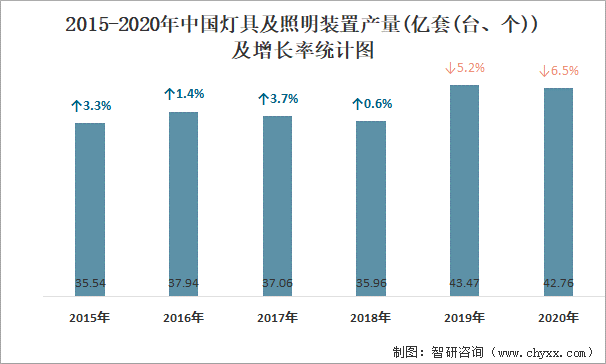 2015-2020年中國燈具及照明裝置產量及增長率統計圖