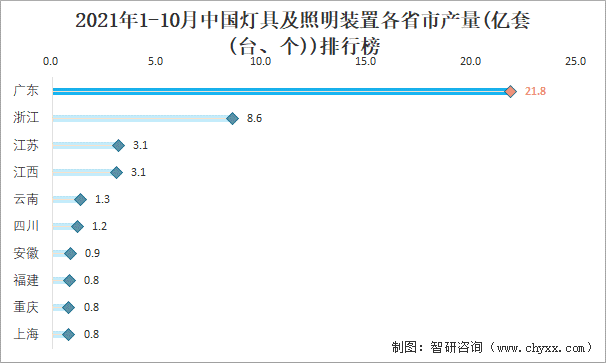 2021年1-10月中國燈具及照明裝置各省市產量排行榜