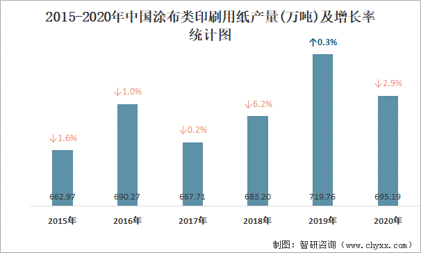 2015-2020年中國涂布類印刷用紙產(chǎn)量及增長率統(tǒng)計圖