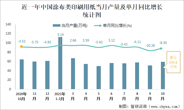 2021年1-10月中國涂布類印刷用紙產(chǎn)量為559.6萬噸 同比下降3.21%