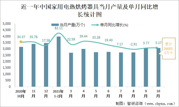 根據(jù)國家統(tǒng)計(jì)局?jǐn)?shù)據(jù)顯示:2021年10月中國家用電熱烘烤器具產(chǎn)量為3069萬個(gè),同比增長5.17%;2021年1-10月中國家用電熱烘烤器具累計(jì)產(chǎn)量為26683.1萬個(gè),同比增長24.63%;2015-2020年中國家用電熱烘烤器具產(chǎn)量2016年跌至最低,此后逐年遞增。