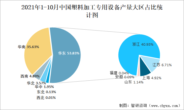 2021年1-10月中國塑料加工專用設備產量為29.4萬臺 華東地區產量最高(占比53.83%)