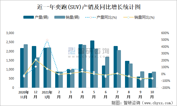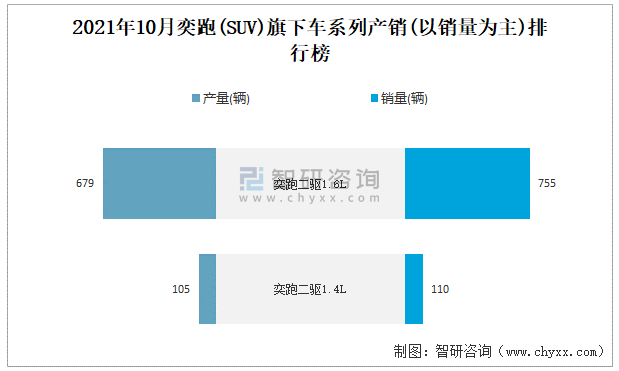根據中國汽車工業協會數據可知:2021年10月奕跑(SUV)產量為784輛,同比下降63%,銷量為865輛,同比下降58.3%,當月產銷率為110.33%;2021年1-10月奕跑(SUV)累計產量為15297輛,同比增長2.9%,累計銷量為15313輛,同比下降5%,累計產銷率為100.1%;2018-2020年奕跑(SUV)產銷量均在2019年達到最高值,此后有所下降,且近3年總產量大于總銷量,積壓了庫存757輛。