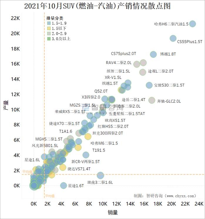 從下圖散點圖可看出,以產銷平均值作為四象限分界線,大部分燃油SUV集中在第一象限,即產多銷多,特別是哈弗H6二驅汽油1.5這款SUV,產量和銷量相對領先于其他燃油SUV;第三象限和第四象限SUV,其產銷率較高(散點大小代表了產銷率),說明大量產銷量不理想的SUV將庫存清理作為主要任務,銷量排名靠前的SUV,以1.5-1.9和2.0-2.9排量為主。