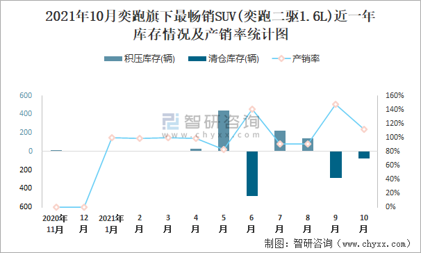 2021年10月奕跑旗下最暢銷SUV(奕跑二驅1.6L)近一年庫存情況及產銷率統計圖