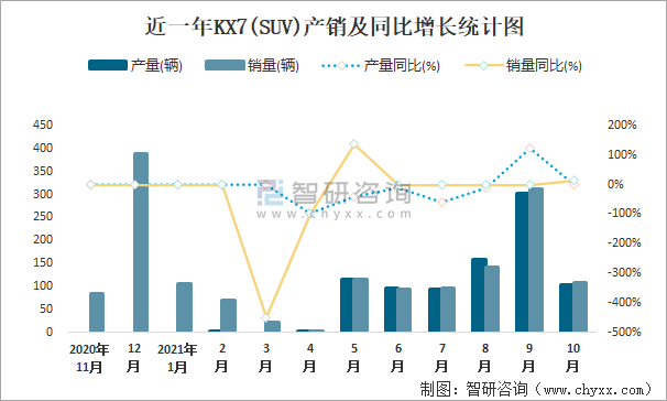 近一年KX7(SUV)產(chǎn)銷及同比增長統(tǒng)計圖