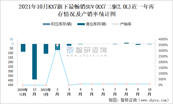 2021年10月KX7旗下最暢銷SUV(KX7二驅(qū)2.0L)近一年庫存情況及產(chǎn)銷率統(tǒng)計圖