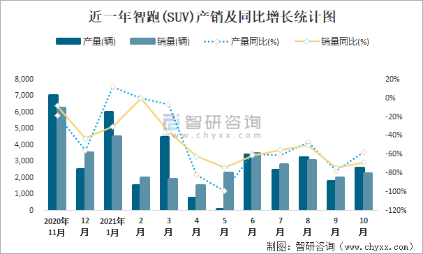 近一年智跑(SUV)產銷及同比增長統計圖