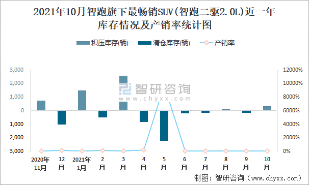 2021年10月智跑旗下最暢銷SUV(智跑二驅2.0L)近一年庫存情況及產銷率統計圖