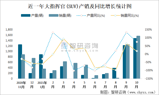 近一年大指揮官(SUV)產(chǎn)銷(xiāo)及同比增長(zhǎng)統(tǒng)計(jì)圖