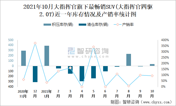 2021年10月大指揮官旗下最暢銷(xiāo)SUV(大指揮官四驅(qū)2.0T)近一年庫(kù)存情況及產(chǎn)銷(xiāo)率統(tǒng)計(jì)圖
