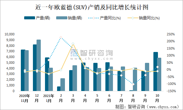 近一年歐藍德(SUV)產銷及同比增長統計圖