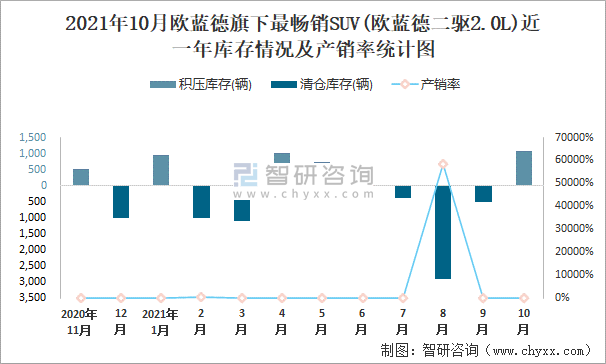2021年10月歐藍德旗下最暢銷SUV(歐藍德二驅2.0L)近一年庫存情況及產銷率統計圖