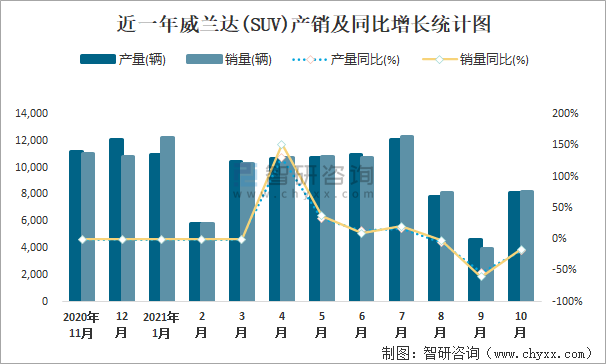 近一年威蘭達(SUV)產銷及同比增長統計圖