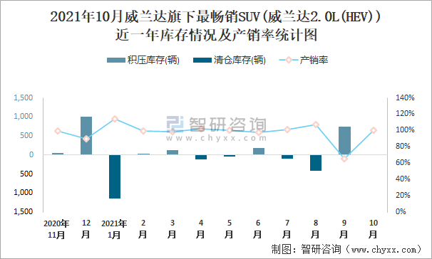 2021年10月威蘭達旗下最暢銷SUV(威蘭達2.0L(HEV))近一年庫存情況及產銷率統計圖