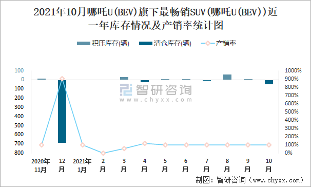 2021年10月哪吒U(BEV)旗下最暢銷SUV(哪吒U(BEV))近一年庫存情況及產(chǎn)銷率統(tǒng)計圖