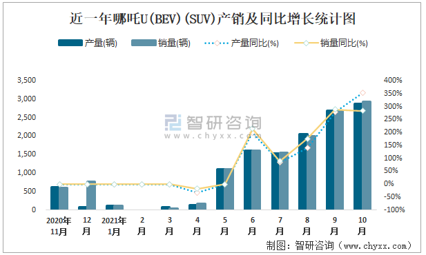 根據(jù)中國汽車工業(yè)協(xié)會數(shù)據(jù)可知:2021年10月哪吒U(BEV)(SUV)產(chǎn)量為2882輛,同比增長354.6%,銷量為2929輛,同比增長282.9%,當月產(chǎn)銷率為101.63%;2021年1-10月哪吒U(BEV)(SUV)累計產(chǎn)量為12210輛,同比增長210.7%,累計銷量為12195輛,同比增長215.2%,累計產(chǎn)銷率為99.88%;且2020年哪吒U(BEV)(SUV)總產(chǎn)量大于總銷量,積壓了庫存5輛。