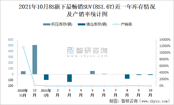 2021年10月8S旗下最暢銷SUV(8S1.6T)近一年庫(kù)存情況及產(chǎn)銷率統(tǒng)計(jì)圖
