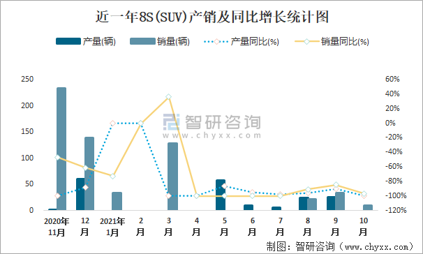 近一年8S(SUV)產(chǎn)銷及同比增長(zhǎng)統(tǒng)計(jì)圖