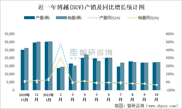 近一年博越(SUV)產銷及同比增長統計圖