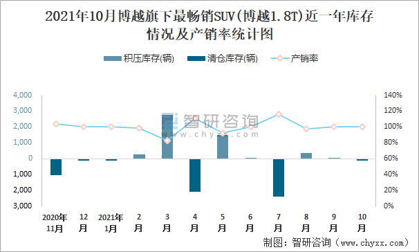 2021年10月博越旗下最暢銷SUV(博越1.8T)近一年庫存情況及產銷率統計圖