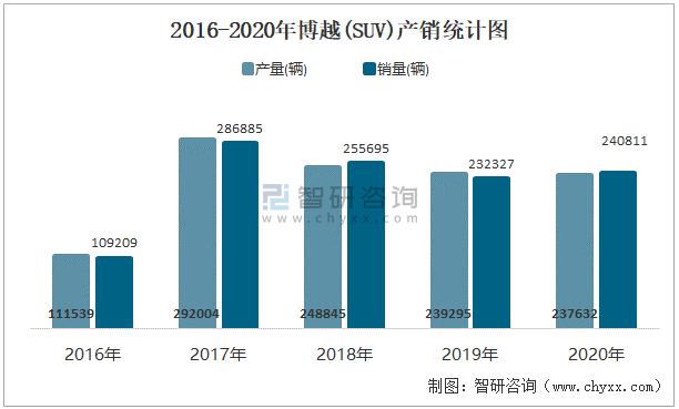 2016-2020年博越(SUV)產銷統計圖
