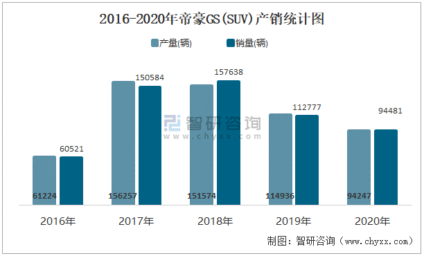2016-2020年帝豪GS(SUV)產(chǎn)銷統(tǒng)計圖