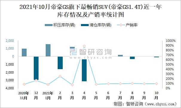 2021年10月帝豪GS旗下最暢銷SUV(帝豪GS1.4T)近一年庫存情況及產(chǎn)銷率統(tǒng)計圖