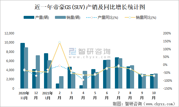 近一年帝豪GS(SUV)產(chǎn)銷及同比增長統(tǒng)計圖