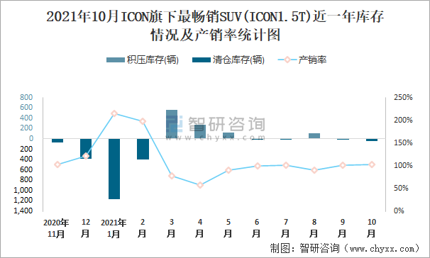 2021年10月ICON旗下最暢銷SUV(ICON1.5T)近一年庫存情況及產銷率統計圖