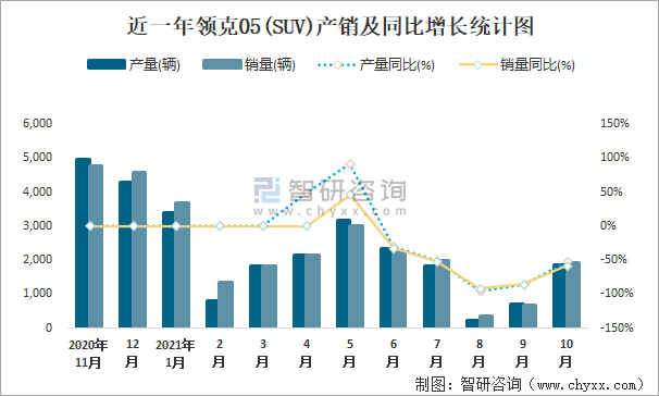 近一年領克05(SUV)產銷及同比增長統計圖