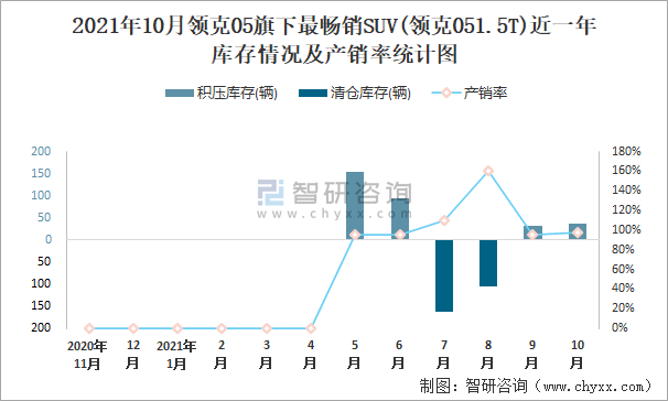 2021年10月領克05旗下最暢銷SUV(領克051.5T)近一年庫存情況及產銷率統計圖