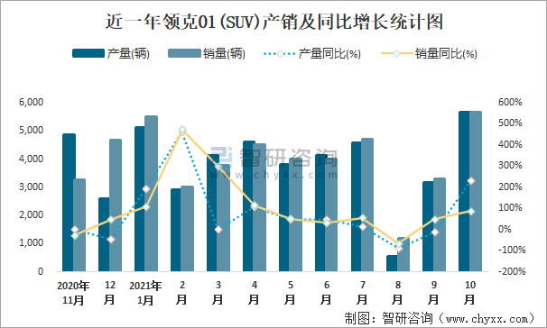 近一年領克01(SUV)產(chǎn)銷及同比增長統(tǒng)計圖