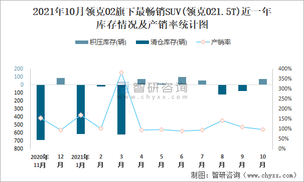2021年10月領克02旗下最暢銷SUV(領克021.5T)近一年庫存情況及產銷率統計圖