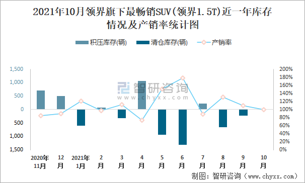 2021年10月領界旗下最暢銷SUV(領界1.5T)近一年庫存情況及產銷率統計圖