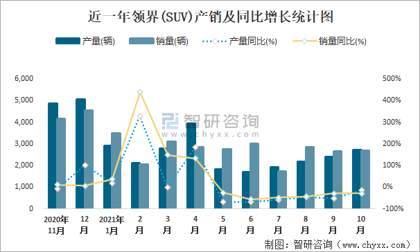 根據中國汽車工業協會數據可知:2021年10月領界(SUV)產量為2712輛,同比下降12%,銷量為2692輛,同比下降29%,當月產銷率為99.26%;2021年1-10月領界(SUV)累計產量為24468輛,同比下降24.1%,累計銷量為27176輛,同比下降13.6%,累計產銷率為111.07%;2019-2020年領界(SUV)產銷量有所下降,且近2年總產量大于總銷量,積壓了庫存2446輛。