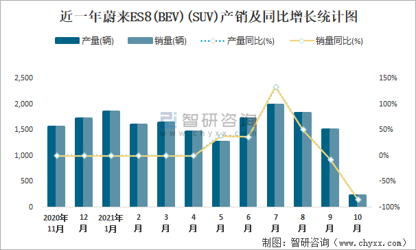 2021年10月蔚來ES8(BEV)(SUV)產銷量分別為223輛和223輛 當月產銷率為100%