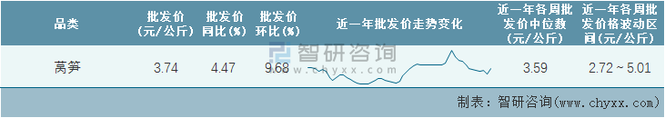 根據(jù)農(nóng)村農(nóng)業(yè)部數(shù)據(jù)統(tǒng)計可知:2022年第1周全國萵筍平均批發(fā)價為3.74元/公斤,同比增加4.47%,環(huán)比增加9.68%,近一年萵筍價格2021年下半年出現(xiàn)高峰值,近一年全國萵筍平均批發(fā)價最高達到5.01元/公斤,批發(fā)價最低也要2.72元/公斤。