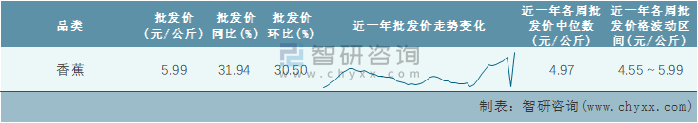 2022年第1周(2021年12月27日-2022年1月2日)全國香蕉平均批發價分析:本周批發價為5.99元/公斤,同比增加31.94%