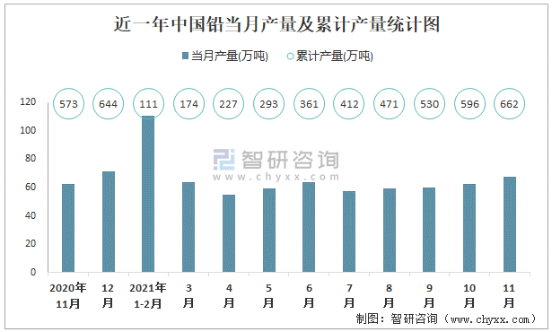 根據(jù)國家統(tǒng)計局數(shù)據(jù)顯示:2021年11月中國鉛產(chǎn)量為67.3萬噸,同比增長7.9%;2021年1-11月中國鉛累計產(chǎn)量為662.4萬噸,累計增長12.4%;2015-2020年中國鉛產(chǎn)量逐年遞增,在2020年達到最高。