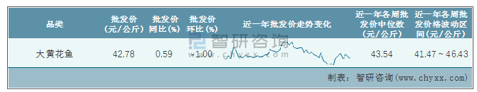 根據農村農業部數據統計可知:2022年第1周全國大黃花魚平均批發價為42.78元/公斤,同比增加0.59%,環比下跌1%,近一年大黃花魚價格在一定范圍波動,總體呈現下降趨勢,近一年全國大黃花魚平均批發價最高達到46.43元/公斤,批發價最低也要41.47元/公斤。