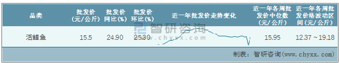 根據農村農業部數據統計可知:2022年第1周全國活鯉魚平均批發價為15.5元/公斤,同比增加24.9%,環比增加25.3%,近一年活鯉魚價格2021年年末探底后快速回升,近一年全國活鯉魚平均批發價最高達到19.18元/公斤,批發價最低也要12.37元/公斤。