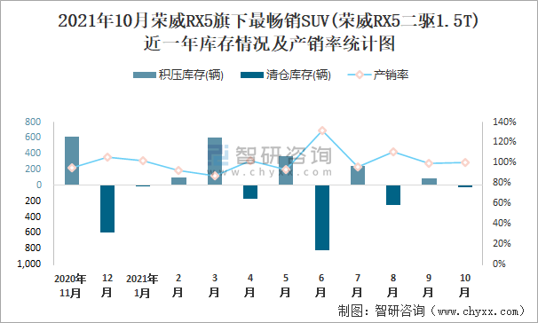 2021年10月榮威RX5旗下最暢銷SUV(榮威RX5二驅1.5T)近一年庫存情況及產銷率統計圖