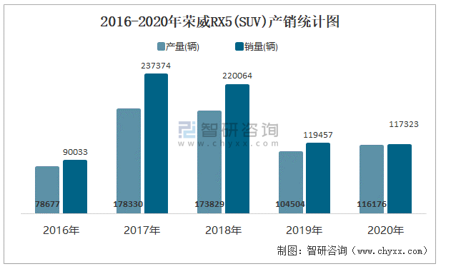 2016-2020年榮威RX5(SUV)產銷統計圖