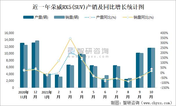 近一年榮威RX5(SUV)產銷及同比增長統計圖
