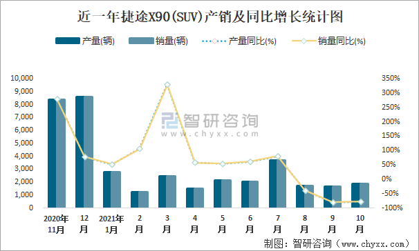 近一年捷途X90(SUV)產銷及同比增長統計圖