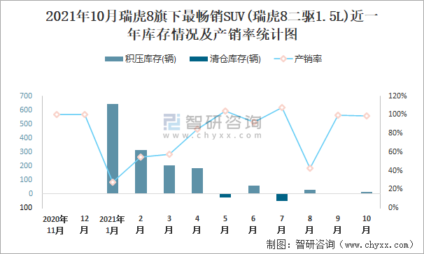 2021年10月瑞虎8旗下最暢銷SUV(瑞虎8二驅(qū)1.5L)近一年庫(kù)存情況及產(chǎn)銷率統(tǒng)計(jì)圖