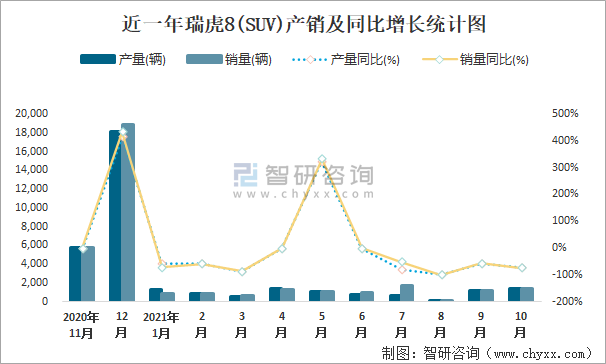 近一年瑞虎8(SUV)產(chǎn)銷及同比增長(zhǎng)統(tǒng)計(jì)圖