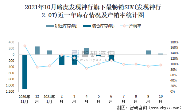2021年10月路虎發現神行旗下最暢銷SUV(發現神行2.0T)近一年庫存情況及產銷率統計圖