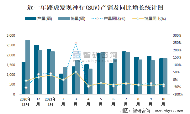根據中國汽車工業協會數據可知:2021年10月路虎發現神行(SUV)產量為1831輛,同比下降42.6%,銷量為1820輛,同比下降31.4%,當月產銷率為99.4%;2021年1-10月路虎發現神行(SUV)累計產量為17793輛,同比下降18.3%,累計銷量為17998輛,同比下降15.5%,累計產銷率為101.15%;2016-2020年路虎發現神行(SUV)銷量在2017年達到最高值,此后總體呈下降趨勢,且近5年總產量大于總銷量,積壓了庫存433輛。